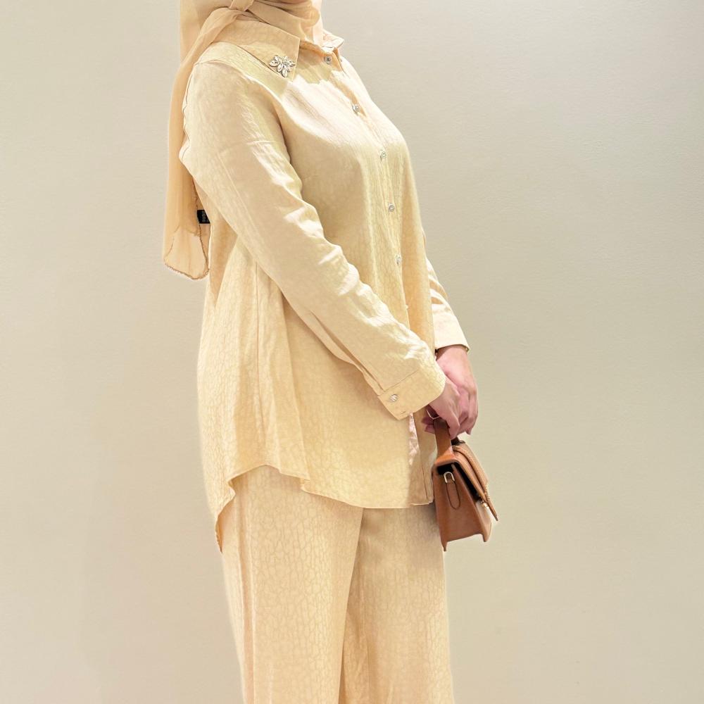 - تأتي البدلة بلون بيج أنيق يمنحكِ إطلالة ناعمة وعصرية يمكن تنسيقها بسهولة مع مختلف الإكسسوارات والأحذية.
