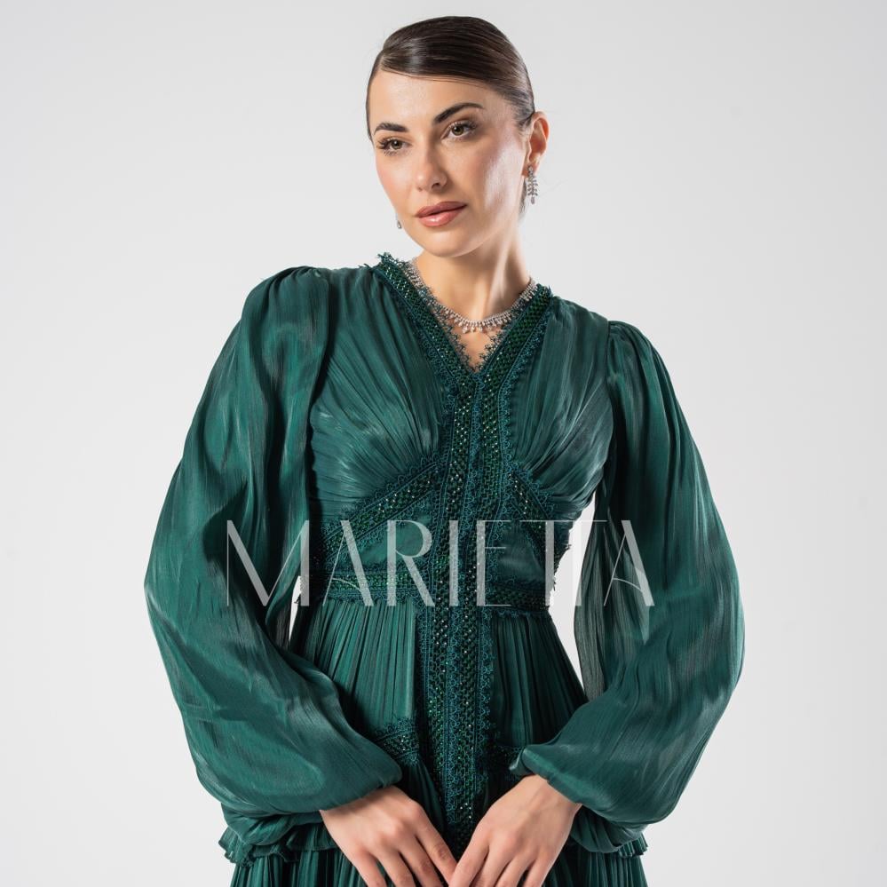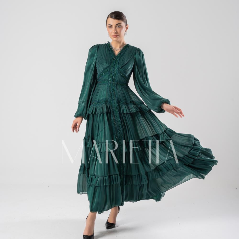 فستان أخضر غامق يتناسب مع جميع ألوان البشرة مريح وخفيف الوزن من كوليكشن العيد.